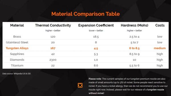 After much research and development, the German startup found that tungsten would be the most beneficial material for creating their nozzle both in terms of quality and in price. While they explain that diamonds would be superior in quality to tungsten because of their high thermal conductivity and hardness, and their low expansion coefficient, the cost of producing a nozzle out of the pricey materials would be extravagant. Additionally, using only a diamond tip for the nozzle could risk scratching or breaking the glass print bed if the tip was displaced from the expanding and contracting brass or steel body of the nozzle.